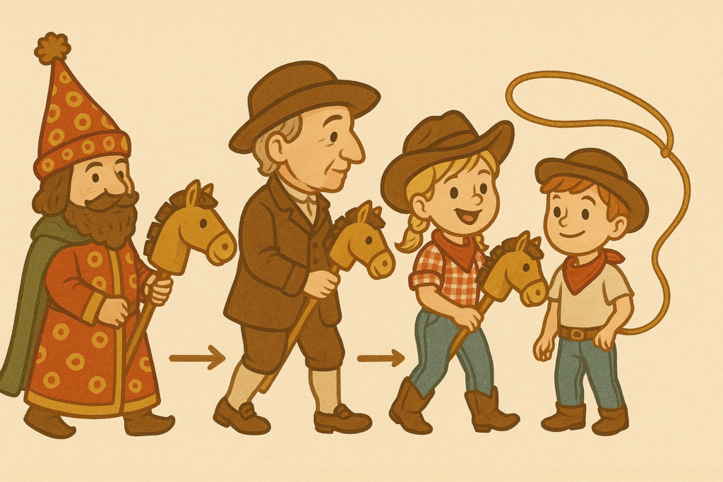Wiele elementów przypomina prawdziwe jeździectwo. Dzieci uczą się rytmu, równowagi, precyzji. Konik dostaje imię, grzywę do czesania, kantar. Z biegiem czasu niektórzy zaczynają ćwiczyć konkretne układy, a nawet startują w zawodach – takich w wersji dziecięcej, z przeszkodami i sędziami, ale w luźnej, przyjaznej atmosferze.